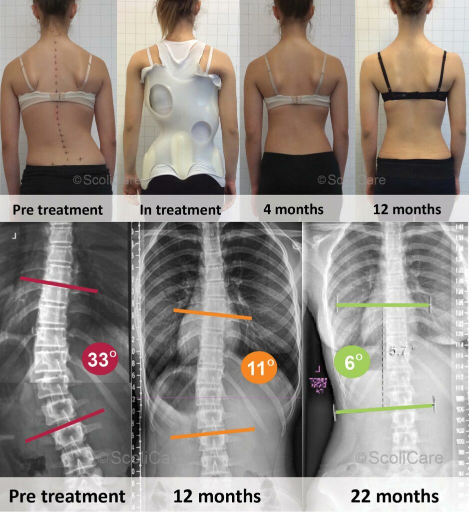 By positioning the body and spine in their over-corrected or mirror image position, the ScoliBrace can have a super-corrective effect. Curve reductions are achieved in the majority of case, as well as improvements to rib humping, shoulder level and the overall appearance of the body.